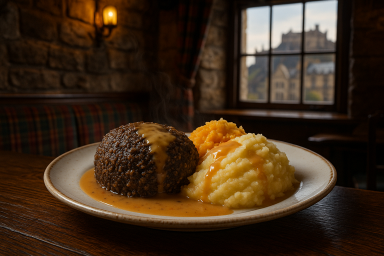 Een klassieker die vaak verrassend goed bevalt: haggis, een hartige mix van orgaanvlees, haver en kruiden, geserveerd met aardappelpuree.