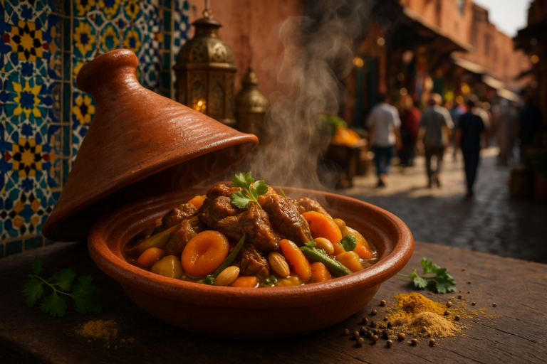 Een stoofgerecht dat langzaam wordt bereid in een aardewerk. Typisch gevuld met lamsvlees, groenten en gedroogd fruit. Kruidig en geurend naar saffraan en kaneel.
