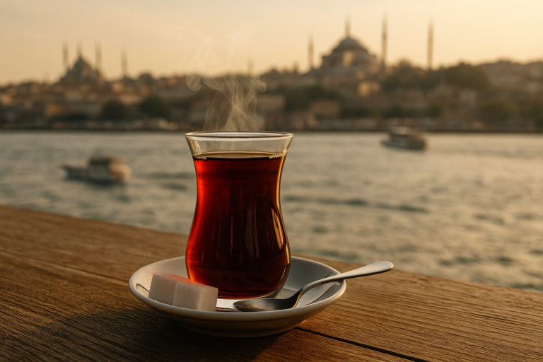 Sterke zwarte thee, geserveerd in kleine tulpvormige glaasjes. Een symbool van gastvrijheid, vaak geschonken tijdens een spontaan gesprek.