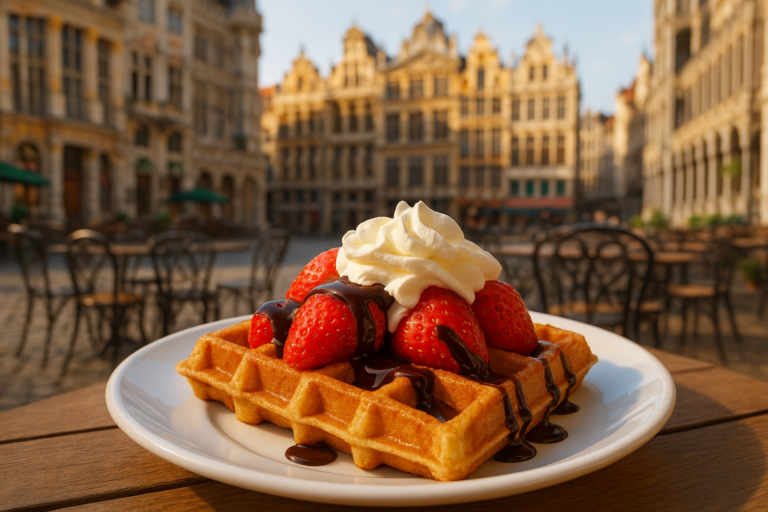 Een warme, knapperige wafel met poedersuiker, slagroom of aardbeien – het ultieme Belgische straatgerecht. Zoet, luchtig en onweerstaanbaar lekker.